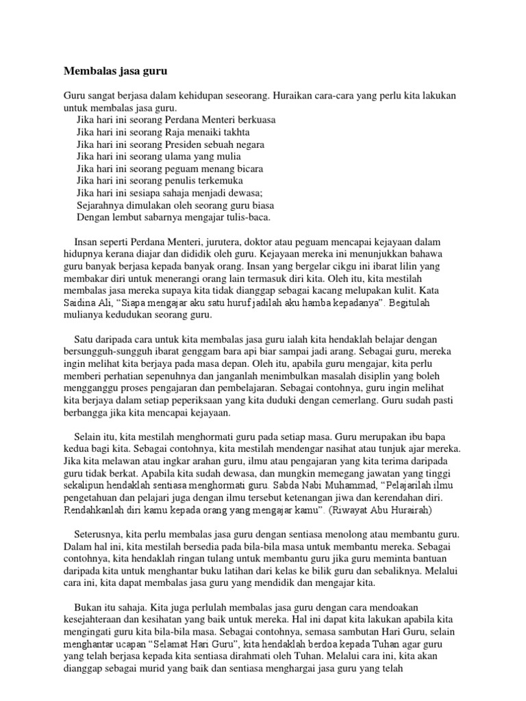 Sepanjang saya berkhidmat ini iaitu selama 7 empat iaitu bermula dari tahun 2012 sehingga ke saat ini saya amat menghargai segala jasa baik kerjasama kasih saying yang telah diberikan oleh semua guru di sekolah. Sambutan Hari Guru di Sekolah Saya Tanggal 16 Mei merupakan Hari Guru. Karangan pt3 - cara menghargai jasa guru - karanga.